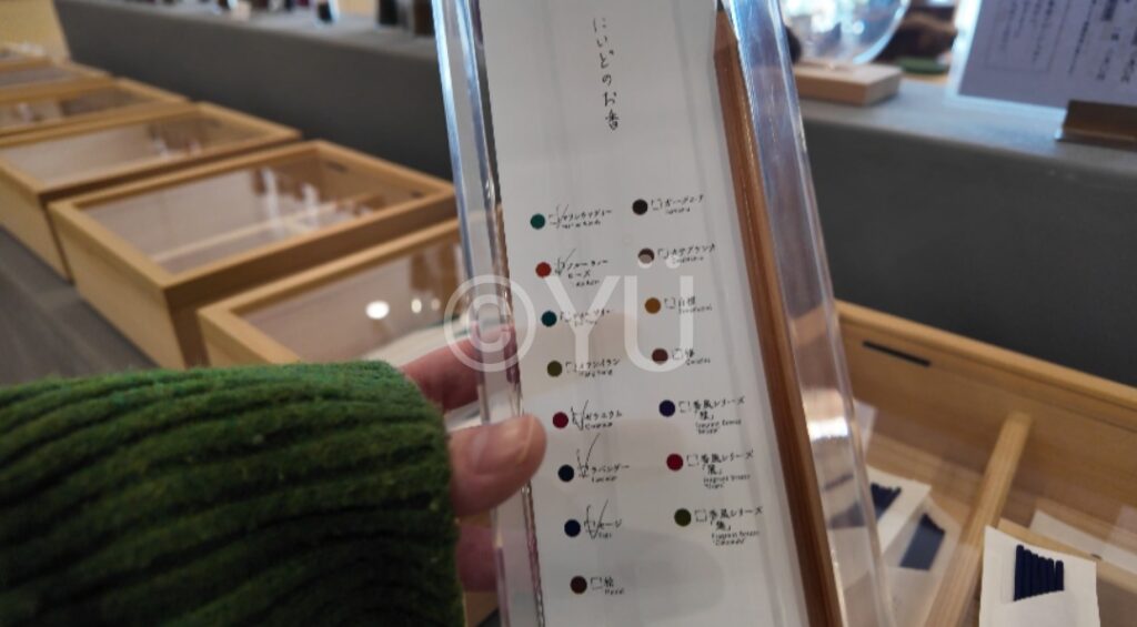 お店の真ん中にある「お香のセレクトバー」では、自分の好きな香りにチェックをつけていき、選んでいきます。